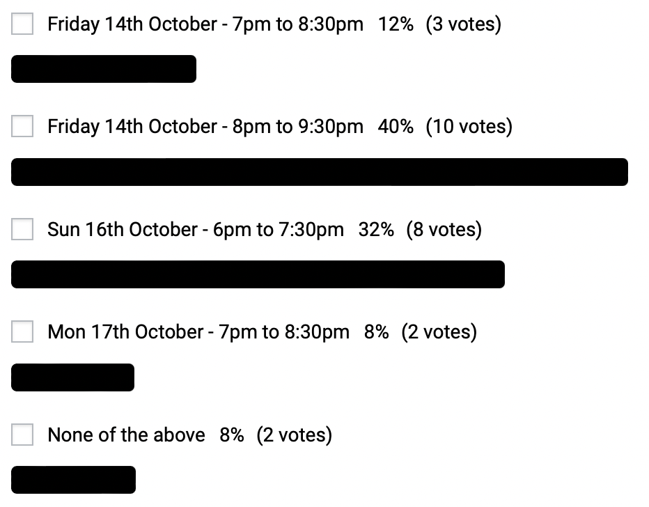 Please vote below for your available dates. You may choose multiple dates but can vote only once. The date with most votes will be selected. Voting ends at 9pm BST on Sun 29th September 2022.